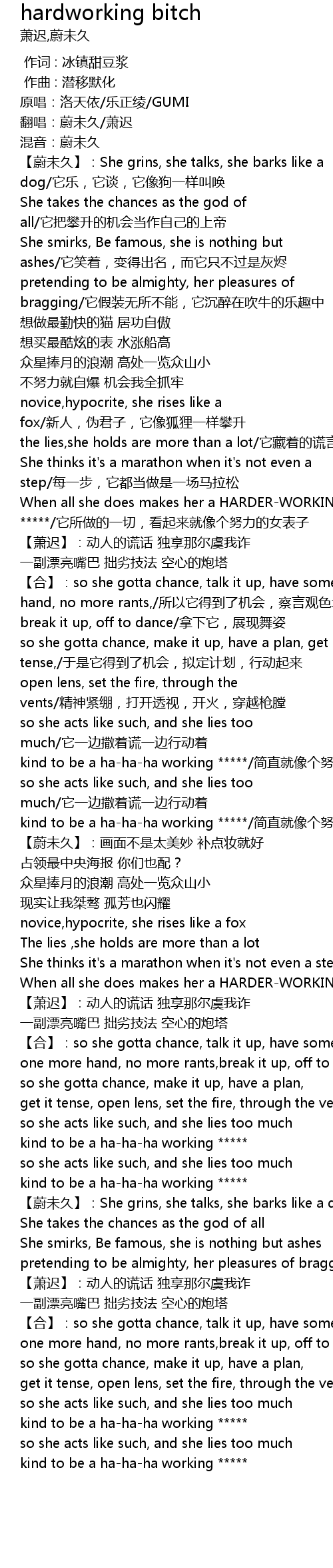| [01:35.00] | kind to be a ha-ha-ha working *****/简直就像个努力的女表子 |