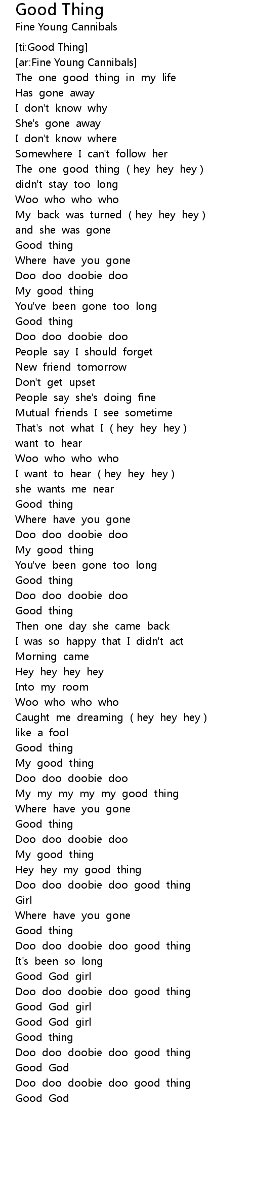 | [03:02.22] | Doo doo doobie doo good thing |