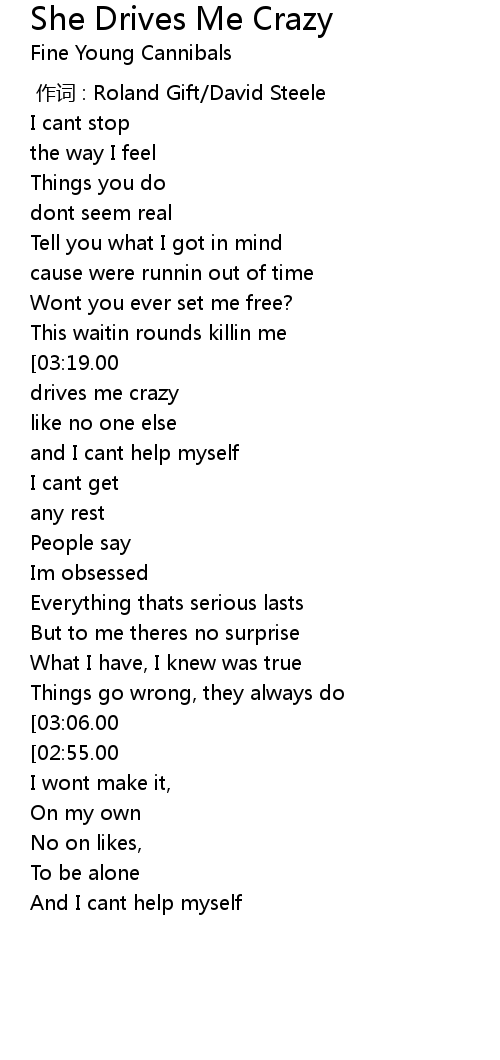 | [03:28.00][03:19.00][03:11.00][03:02.00][02:53.00][02:44.00][02:00.00][01:51.00][01:07.00][00:58.00] | She drives me crazy |