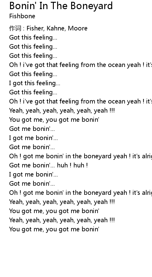 | Oh ! got me bonin' in the boneyard yeah ! it' s alright, yeah ! | |