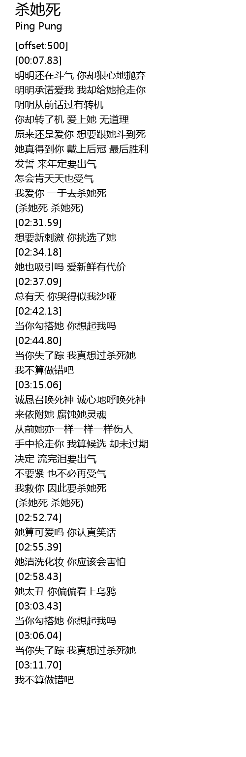 | [01:41.76] | (杀她死 杀她死) |