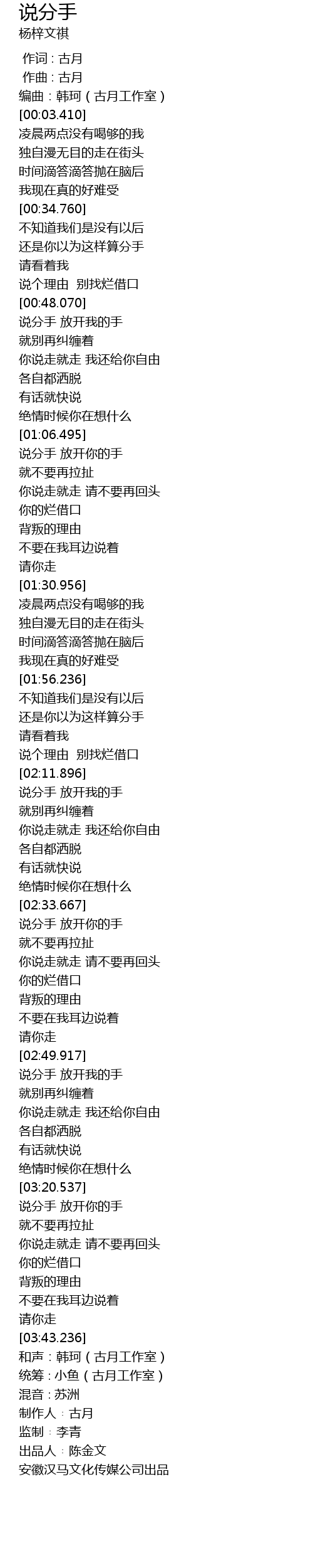| [03:20.787] | shuō fēn shǒu fàng kāi nǐ de shǒu |