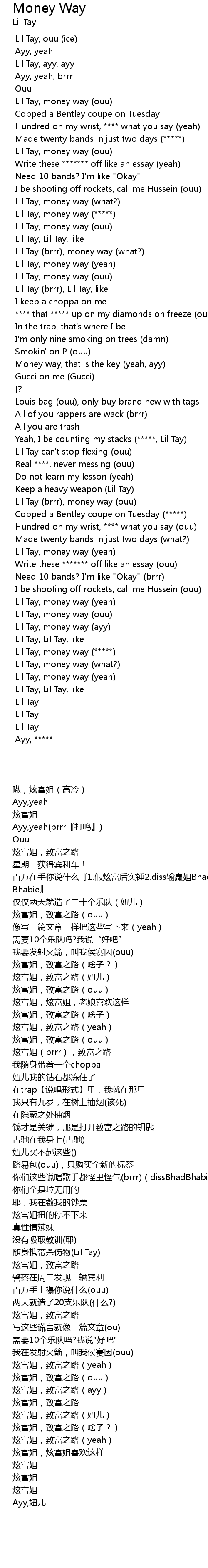 | [01:02.942] | Yeah, I be counting my stacks (*****, Lil Tay) |