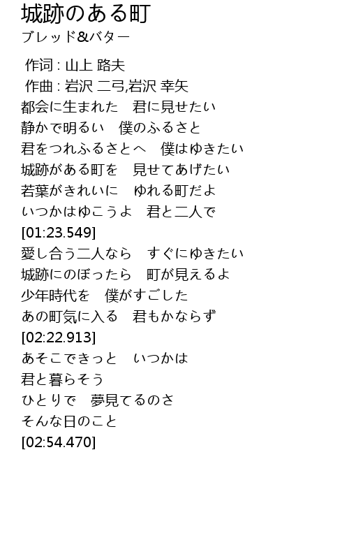 | [01:48.234] | 城跡にのぼったら 町が見えるよ |
