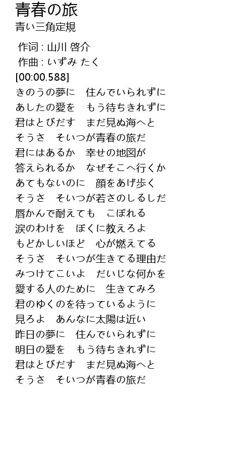 | [00:34.468] | そうさ そいつが青春の旅だ |