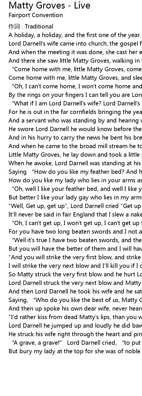 | Saying, " Who do you like the best of us, Matty Groves or me?" | |
