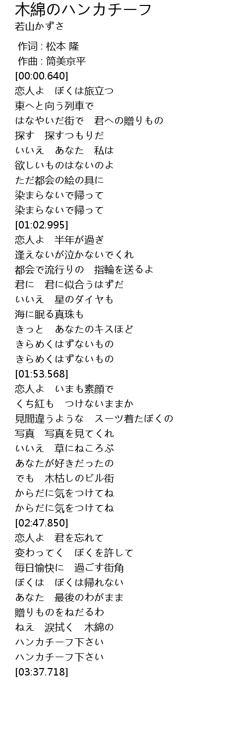 | [03:25.676] | ねえ 涙拭く 木綿の |