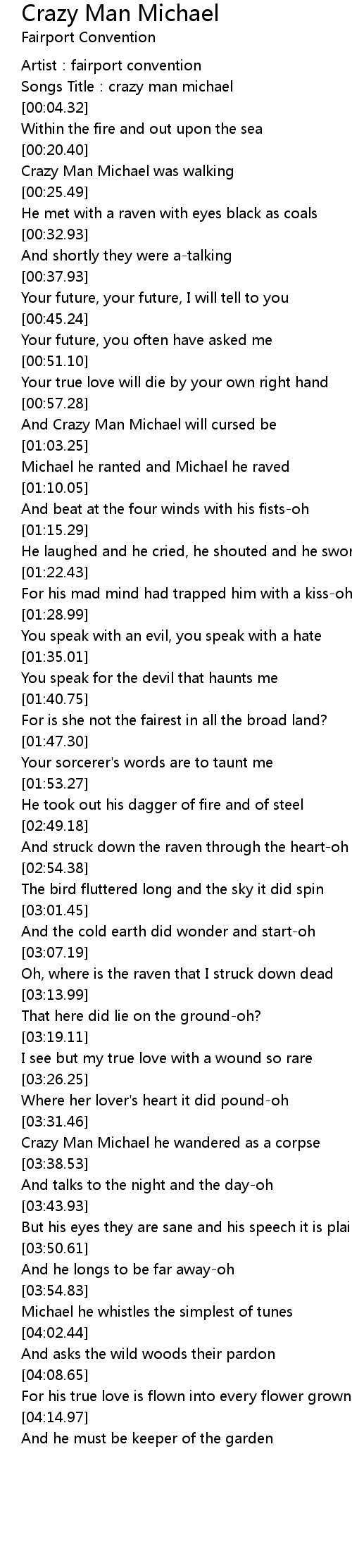 | [03:33.35] | Crazy Man Michael he wandered as a corpse |