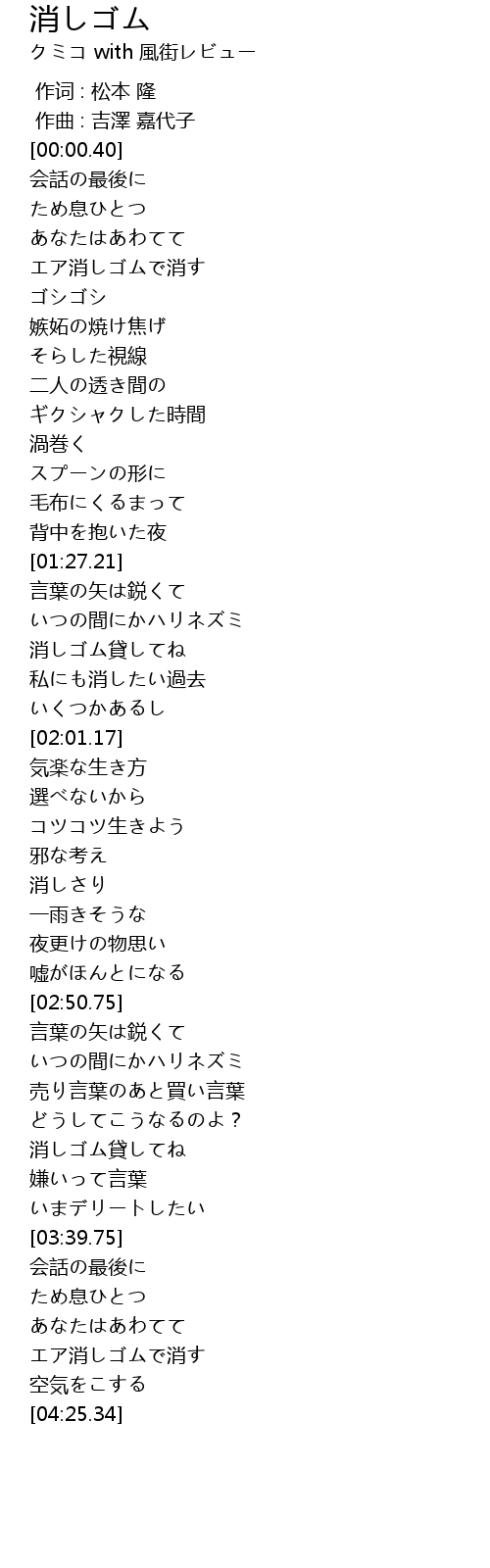 | [03:23.20] | 消しゴム貸してね |