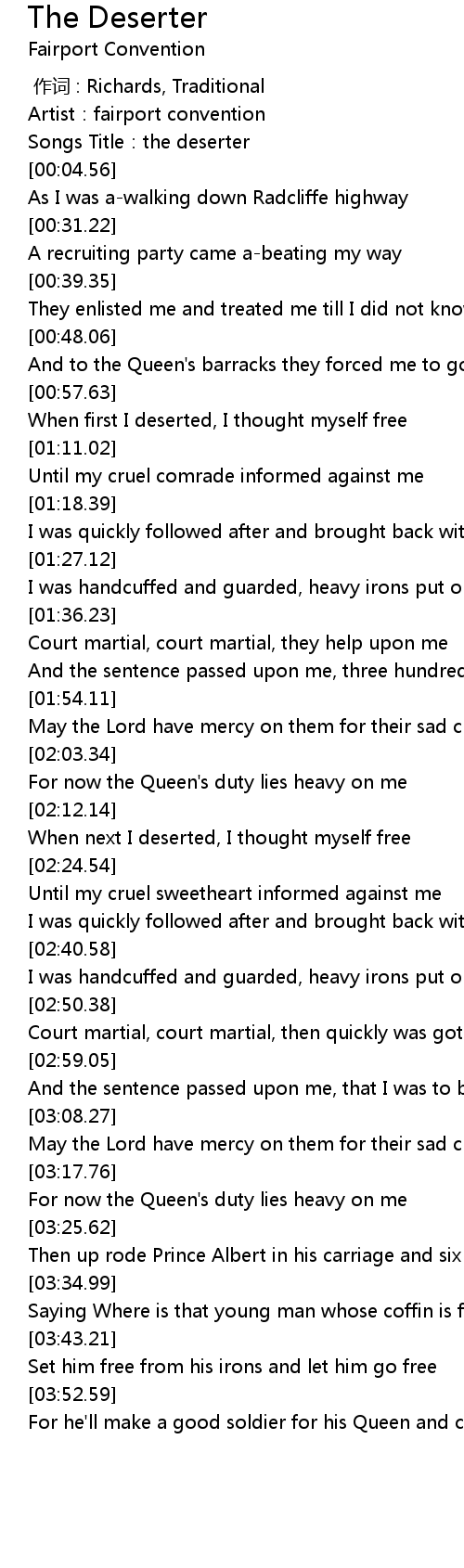 | [00:02.25] | Songs Title:the deserter |