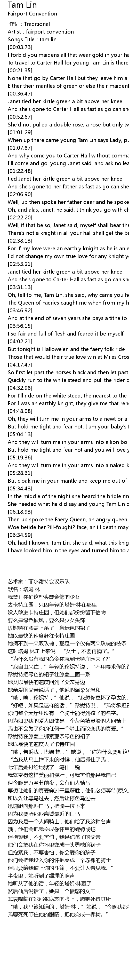| [03:33.26] | Oh, tell to me, Tam Lin, she said, why came you here to dwell? |