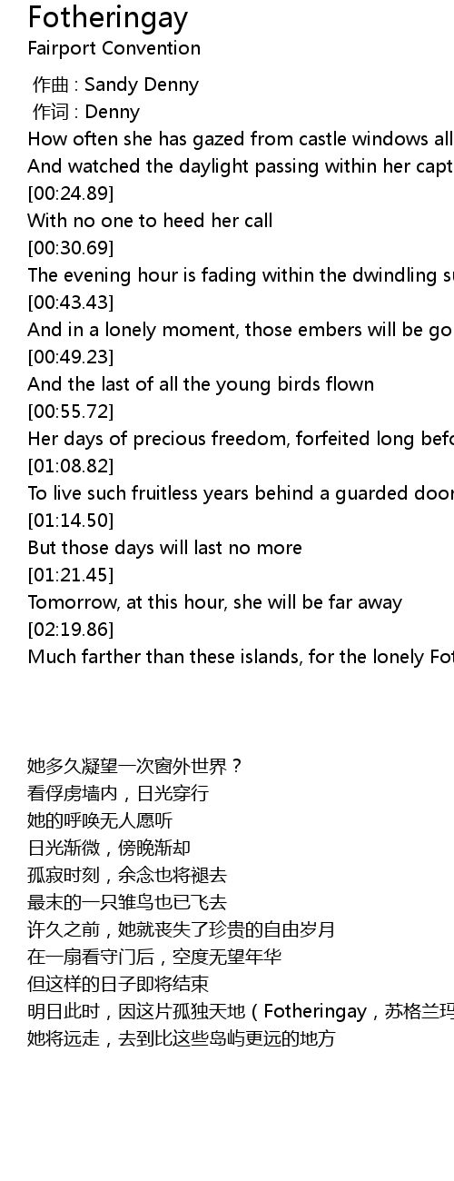 | [02:20.86] | Much farther than these islands, for the lonely Fotheringay |