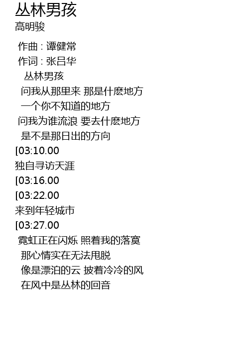 | [03:44.00][03:22.00][02:00.00][01:13.00] | lí kāi gǔ lǎo de cóng lín lái dào nián qīng chéng shì |