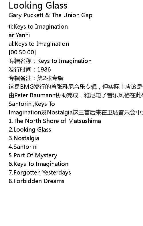 | [01:00.00] | 专辑名称:Keys to Imagination |