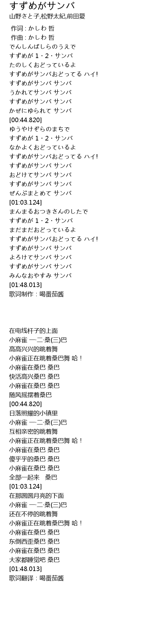 | [01:36.477] | すずめがサンバおどってる ハイ! |