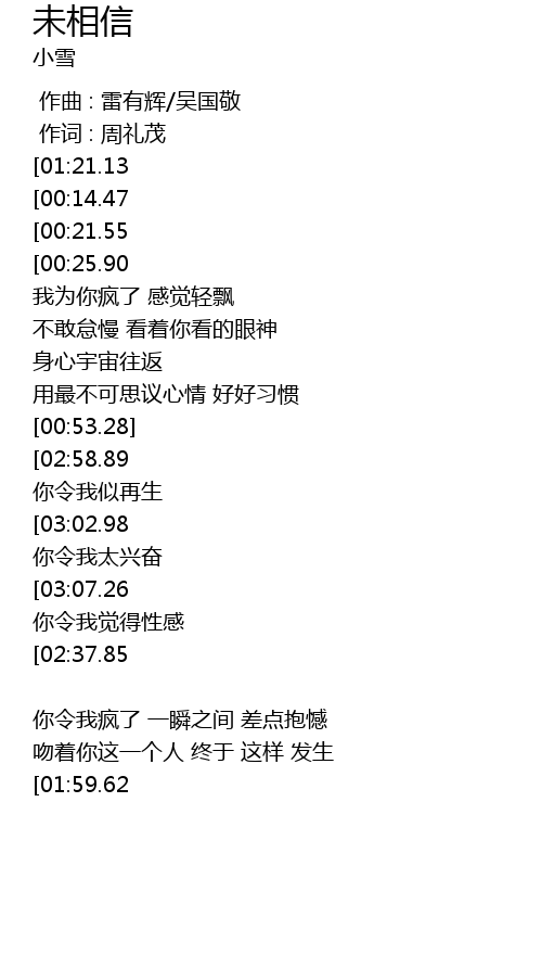 | [03:15.65][02:58.89][02:21.75][02:04.68][00:53.74] | 未相信 Ooh! 你令我似再生 |