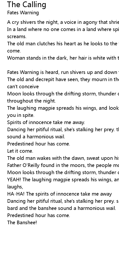 Dancing her pitiful ritual, she's stalking her prey. she's coming your way the bard and the banshee sound a harmonious wail. |