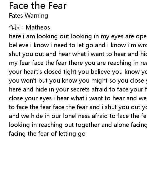 | here i am looking out looking in my eyes are open my mind' s closed tight i believe i know i need to let go and i know i' m wrong but i think i' m right so i shut you out and hear what i want to hear and hide in my opinions afraid to face my fear face the fear there you are reaching in reaching out your arms are open, your heart' s closed tight you believe you know you have to let go and you think you won' t but you know you might so you close your eyes and pretend you' re no here and hide in your secrets afraid to face your fear face the fear and you close your eyes i hear what i want to hear and we hide in our suspicions afraid to face the fear face the fear and i shut you out you pretend you' re not here and we hide in our loneliness afraid to face the fear face the fear here we are looking in reaching out together and alone facing the fear we' re afraid to show facing the fear of letting go |