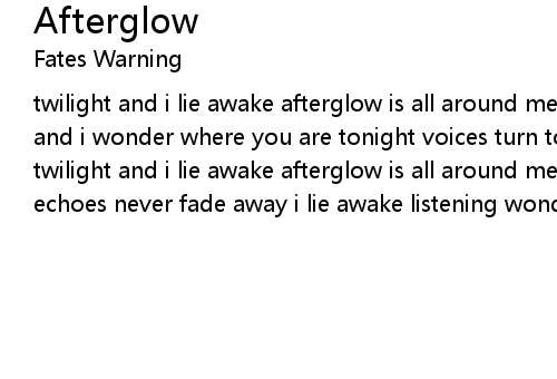 | twilight and i lie awake afterglow is all around me i lie awake, in this light and i wonder where you are tonight voices turn to silence echoes never fade away twilight and i lie awake afterglow is all around me voices turn to silence echoes never fade away i lie awake listening wondering where you are today |