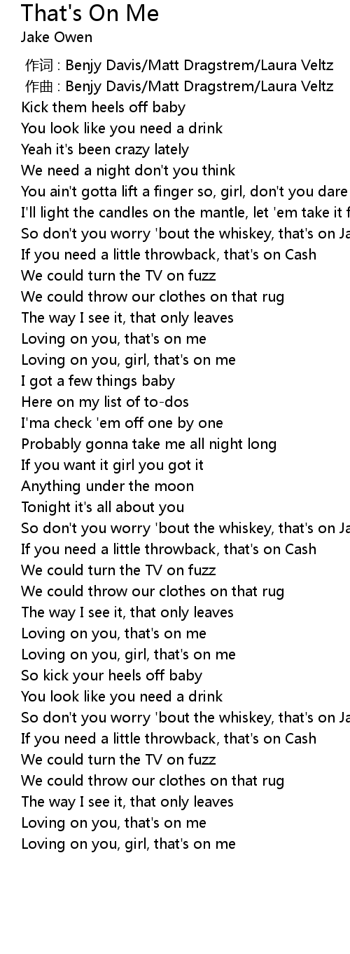 | [02:04.382] | Loving on you, girl, that' s on me |