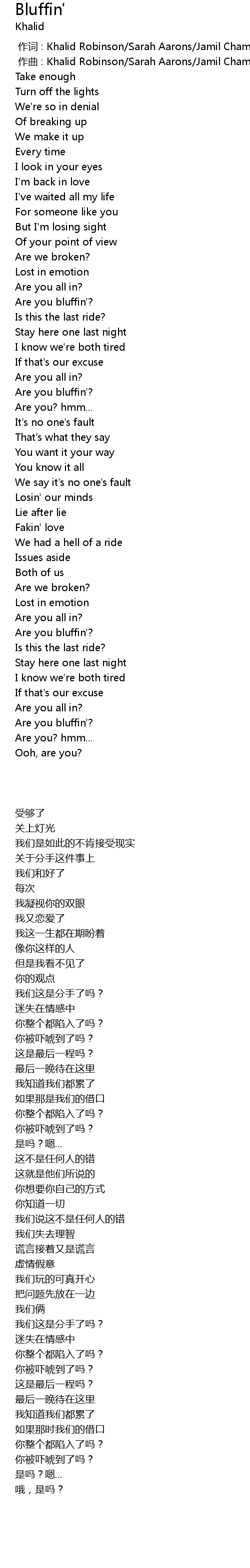 | [00:01.000] | zuò qǔ : Khalid Robinson Sarah Aarons Jamil Chammas Ryan Vojtesak |