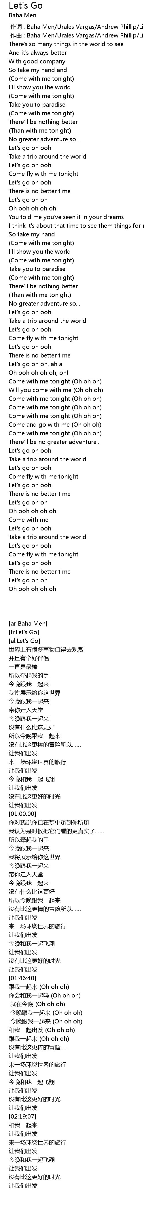 | [00:01.000] | zuo qu : Baha Men Urales Vargas Andrew Phillip Linden Joseph |