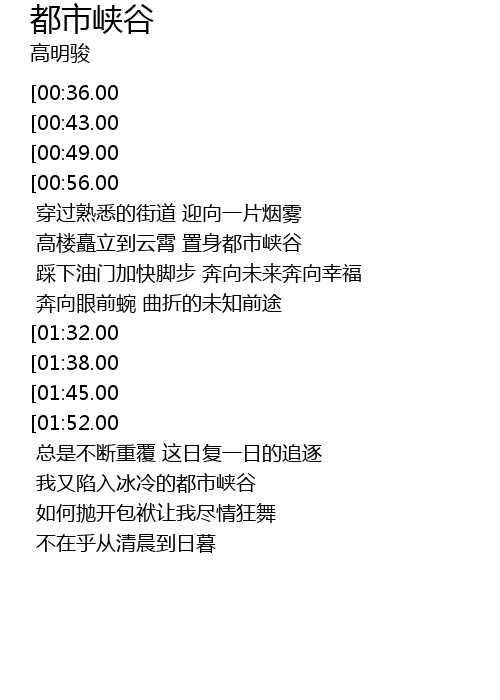 | [01:11.00] | 高楼矗立到云霄 置身都市峡谷 |