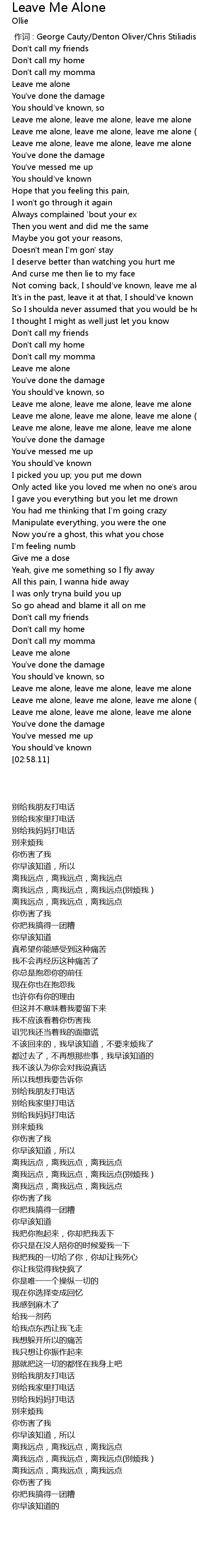 | [02:38.32] | Leave me alone, leave me alone, leave me alone (Leave me) |