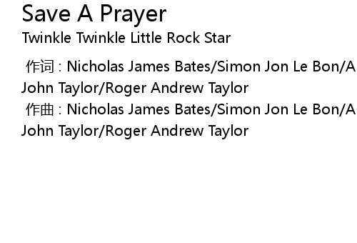 | [00:00.000] | 作词 : Nicholas James Bates/Simon Jon Le Bon/Andrew Taylor/Nigel John Taylor/Roger Andrew Taylor |