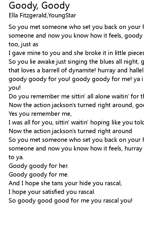 | So you lie awake just singing the blues all night, goody goody! and you found that loves a barrell of dynamite! hurray and halleluyah, you had it comin to ya goody goody for you! goody goody for me! ya i hope you're satisfied you rascal you! | |