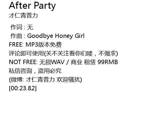 | [00:06.38] | NOT FREE: 无损WAV / 商业 租赁 99RMB |