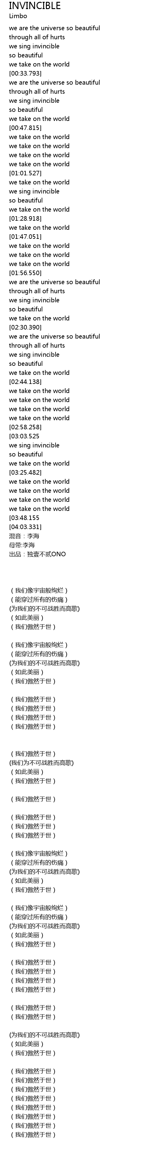 | [00:40.858] | we sing invincible |