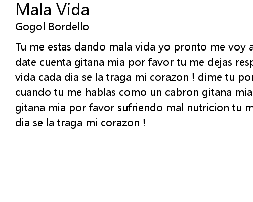 | Tu me estas dando mala vida yo pronto me voy a escapar gitana mia por lo menos date cuenta gitana mia por favor tu me dejas respirar tu me estas dando mala vida cada dia se la traga mi corazon ! dime tu porque te trato yo tan bien cuando tu me hablas como un cabron gitana mia ! mi corazito est ufriendo gitana mia por favor sufriendo mal nutricion tu me estas dando mala vida cada dia se la traga mi corazon ! |