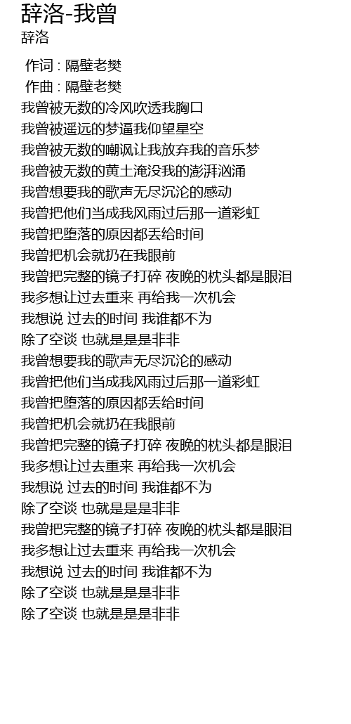 | [00:00.000] | 作词 : 隔壁老樊 |