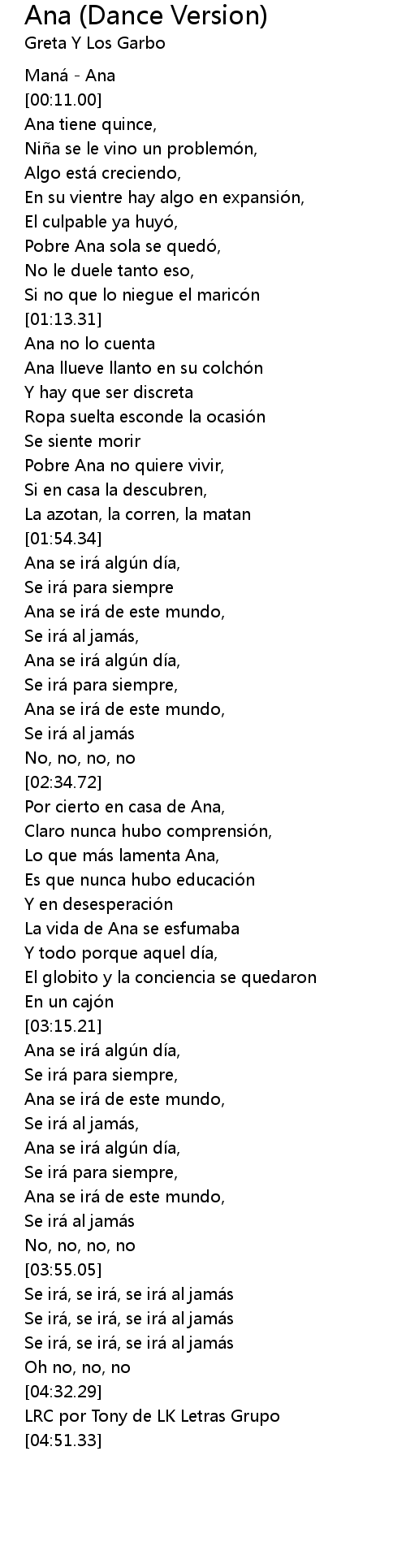 | [02:51.33] | Lo que ma s lamenta Ana, |