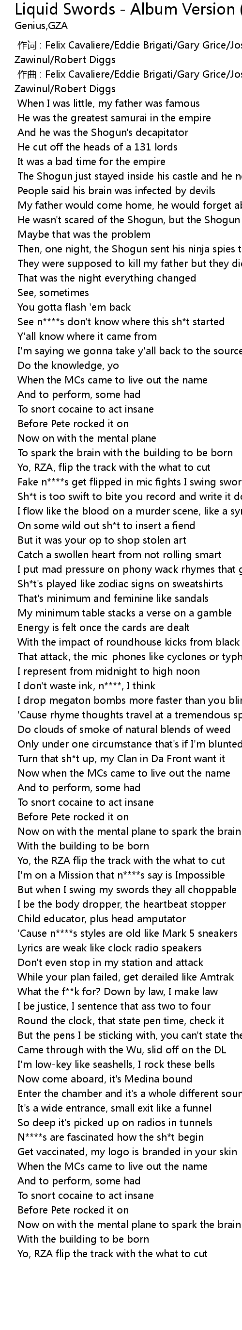 | [01:47.388] | Fake n****s get flipped in mic fights I swing swords and cut clowns |