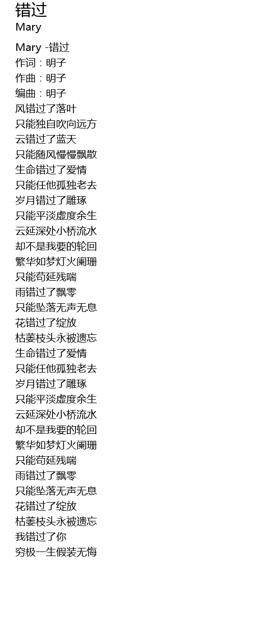 | [00:00.00] | Mary -错过 |