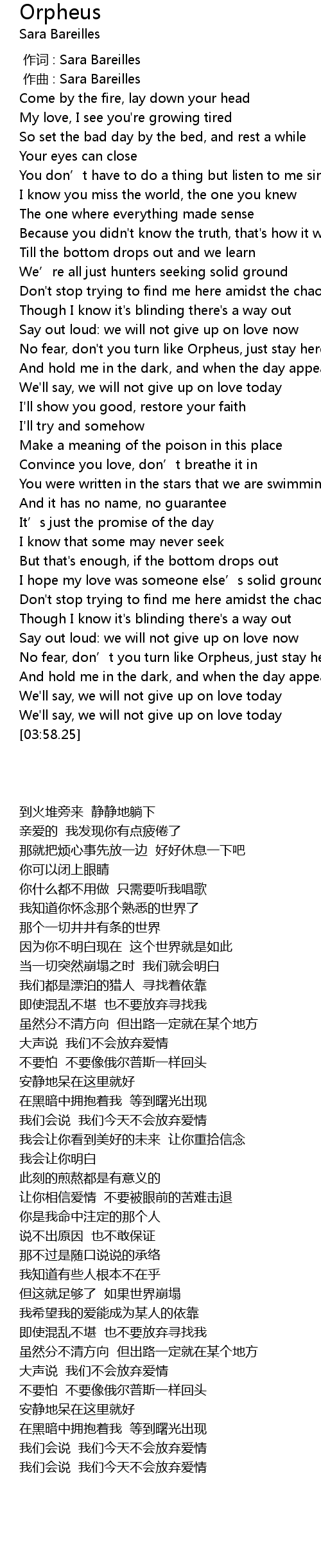 | [03:18.40] | No fear, don' t you turn like Orpheus, just stay here |