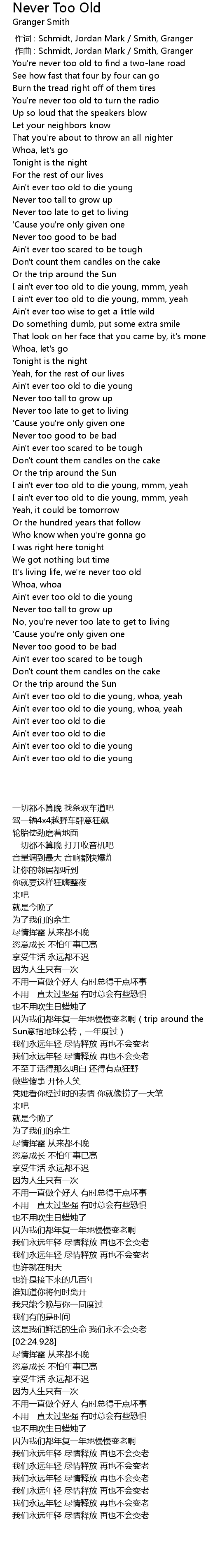 | [02:51.498] | Ain't ever too old to die young, whoa, yeah |