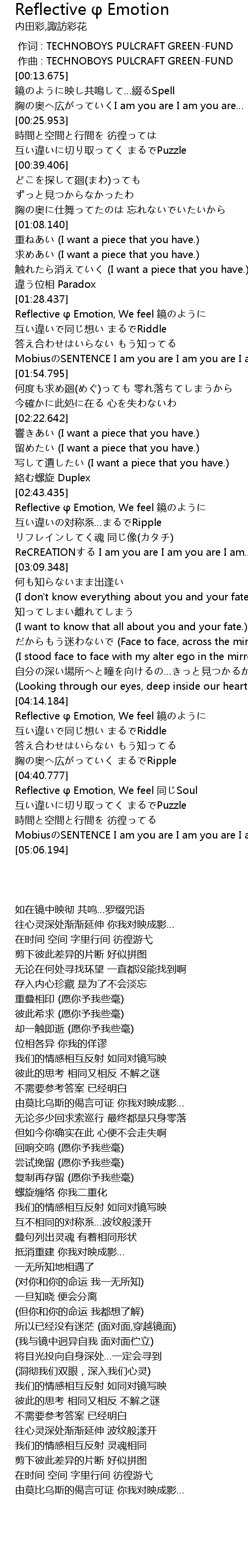 | [04:15.543] | Reflective φ Emotion, We feel 鏡のように |