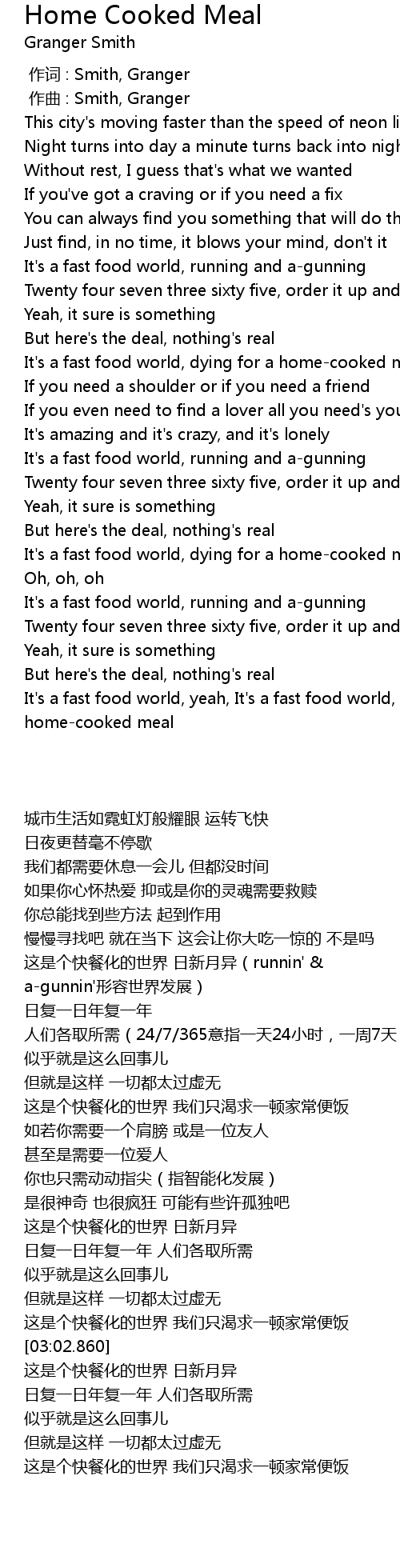 | [03:54.936] | It' s a fast food world, yeah, It' s a fast food world, dying for a homecooked meal |