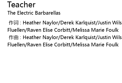 | [00:00.000] | 作词 : Heather Naylor/Derek Karlquist/Justin Wilson/Jannifer Fluellen/Raven Elise Corbitt/Melissa Marie Foulk |