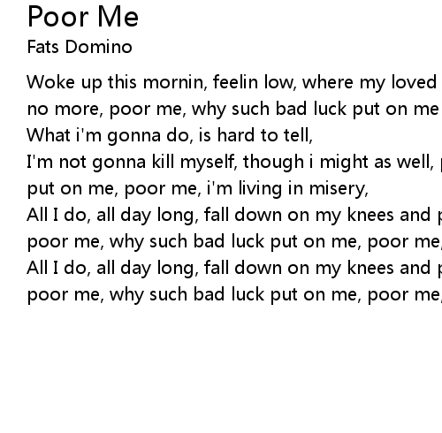 Woke up this mornin, feelin low, where my loved one used to live, she aint there no more, poor me, why such bad luck put on me poor me, i'm living in misery,