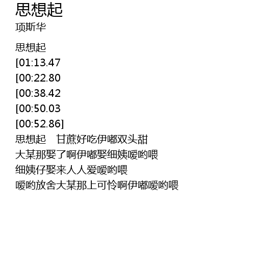 | [02:14.18][01:13.47][00:03.40] | 思啊想起 枫港过去呀伊嘟是车城 |
