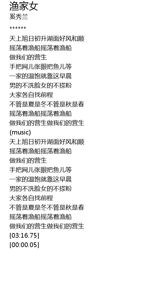 | [01:15.72] | 摇荡着渔船摇荡着渔船 |