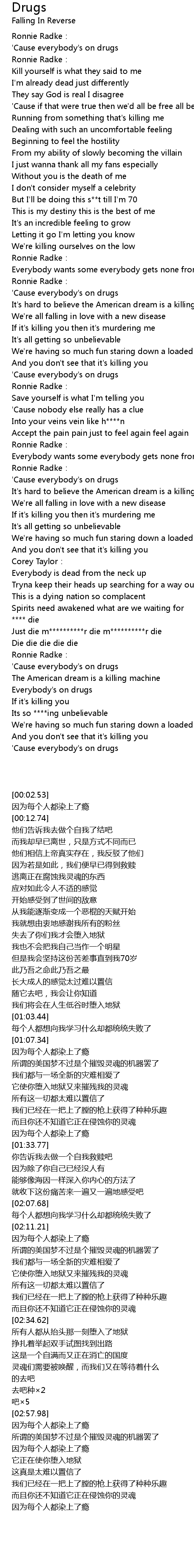 | [02:58.95] | ' Cause everybody' s on drugs |