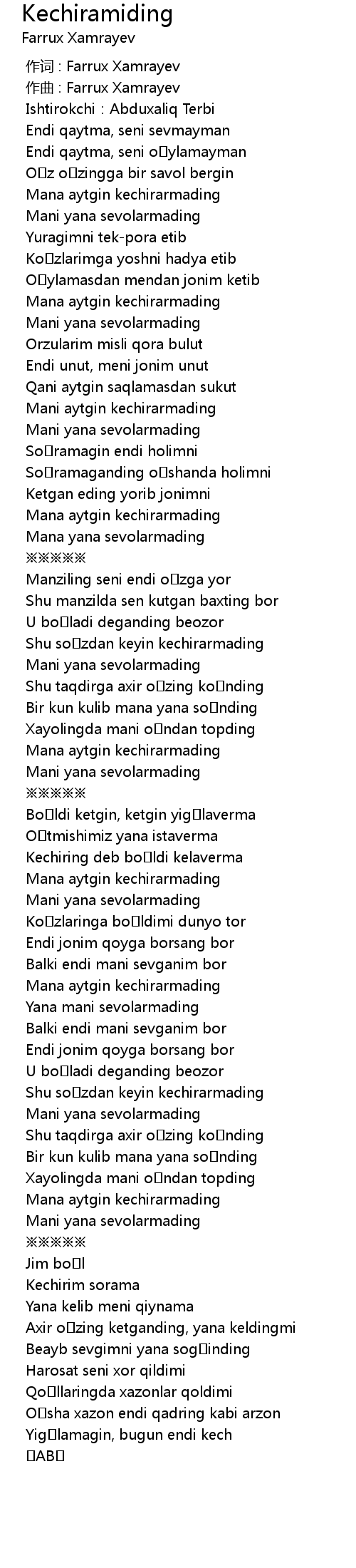 | [00:00.000] | 作词 : Farrux Xamrayev |
