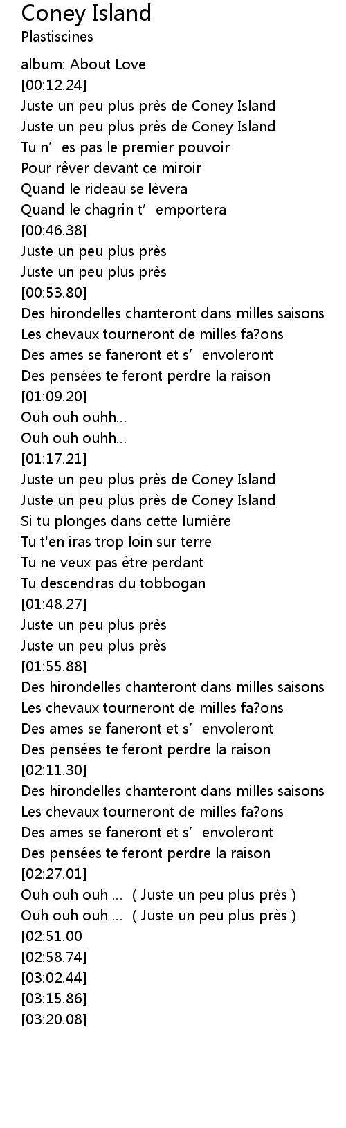 | [00:23.80] | Juste un peu plus prè s de Coney Island |