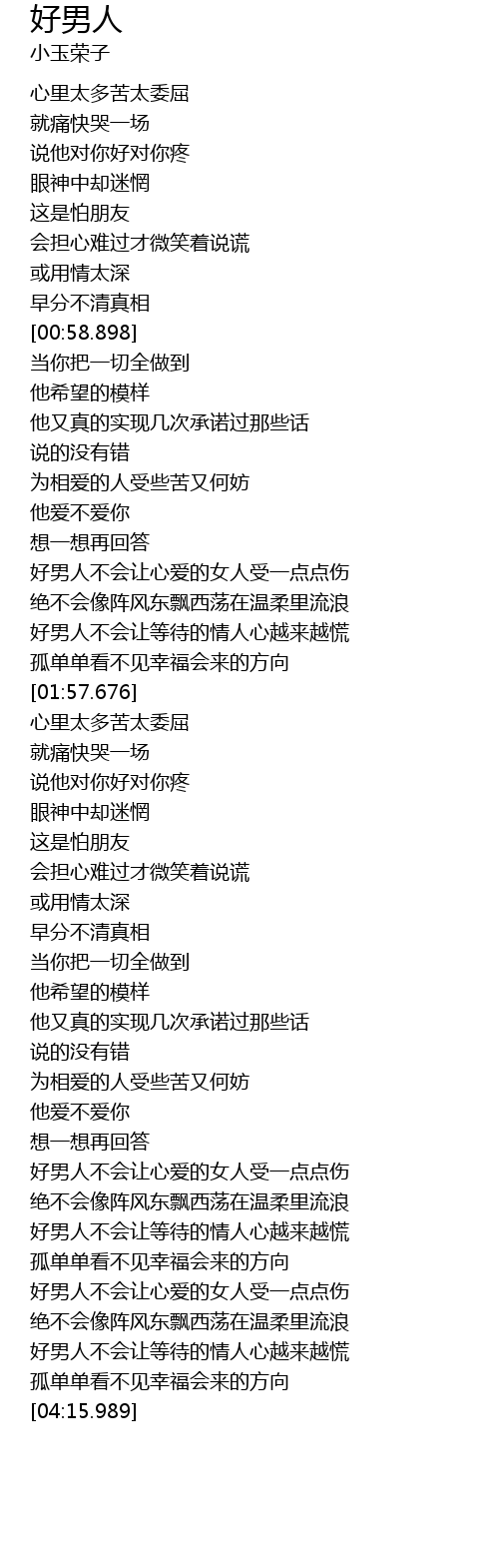 | [04:00.180] | 好男人不会让等待的情人心越来越慌 |
