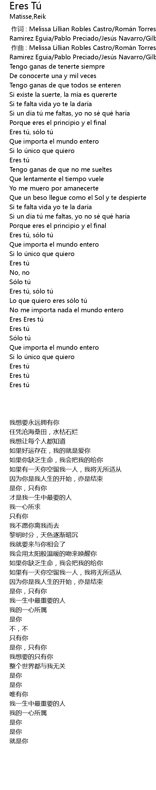 | [00:01.000] | zuò qǔ : Melissa Lillian Robles Castro Romá n Torres Cuevas Julio Ramirez Eguia Pablo Preciado Jesú s Navarro Gilberto Marí n |
